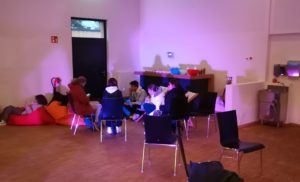 Am Samstag Abend gab es wieder ein Chillout. Die Teilnehmer*innen haben gemeinsam auf Sitzsäcken Mario Kart an der Nintendo Switch gezockt. Dazu gab es frisches Popcorn direkt aus der Popcornmaschine, zusammen mit jeder Menge anderer Snacks und Musik.